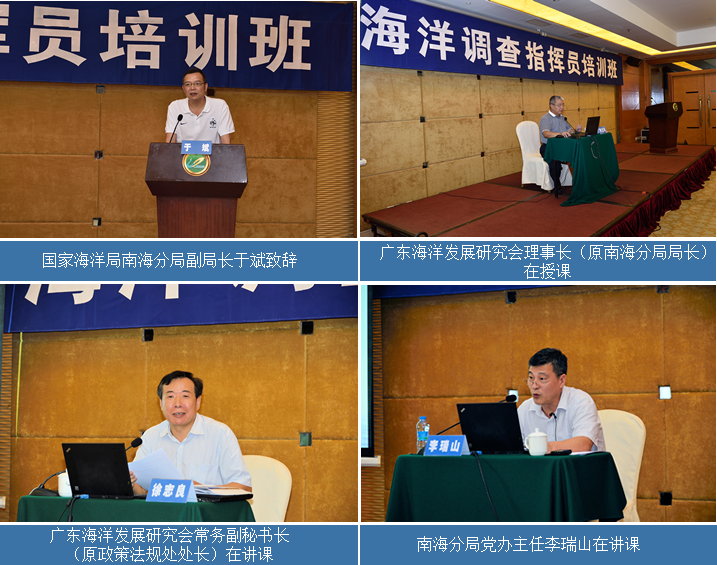 国家海洋局南海分局所属的海洋调查指挥员,基本都是从基层、机关的业务骨干中培养起来的,为提高他们对船舶、飞机、潜器等载体性能的了解,以及海洋环境、政治形势、外交维权和民事活动处置方面的业务综合能力,广东海洋发展研究会受南海分局的委托,承办了为期五天的“海洋调查指挥员培训班”。